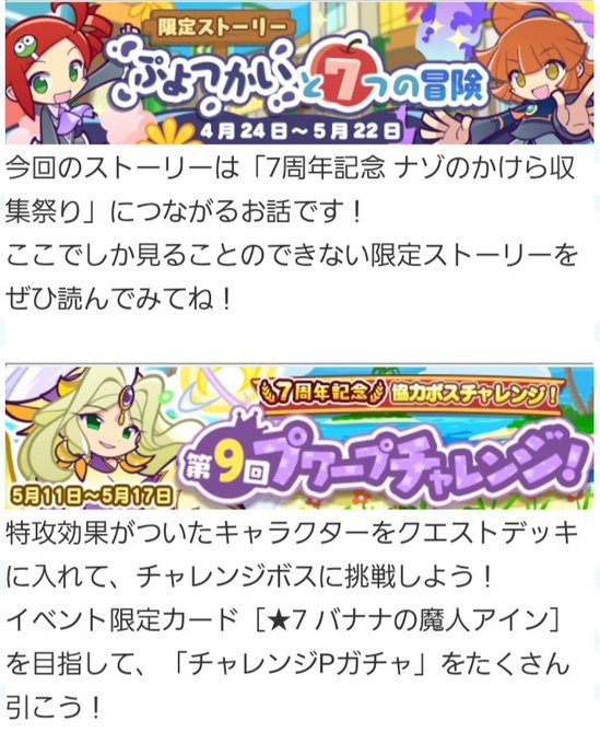 1日限定"7周年記念1日1回クエスト" 開催期間年4月24日0:00~5月22日23:59 "ぷよポイント交換所"に期間限定で"★6お祝いアルル"、"★5お祝いサタン"が追加されます。 ★7へんしん可能"すずらん襲来!"再登場! 開催期間年4月24日15:00~5月22日14:59 "すずらん 7周年記念のlineスタンププレゼント! 指アイコンで遊べる&グッズが当たる! (追加情報!:) ★この指とまりやがれ★ 特設サイトはこちら ゲリラの日限定特別クエスト登場!新アイテムや豪華賞品getのチャンス!ラグナロクオンライン19周年カウントダウンRTキャンペーン 1100 「モンスター大討伐21」開催! 最大250個のクエストをクリアして、報酬をゲットしよう! 1100 仲間とともに100階層の頂を目指せ「エンドレスタワーアナザー ~悲劇の